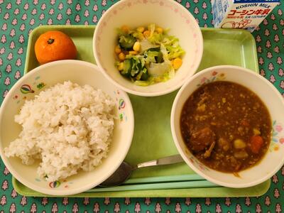 4月18日 牛乳 あめ色玉ねぎ入りポークカレーライス フルーツ寒天和え