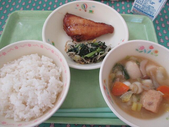 4月19日 牛乳 ご飯 いかのかりん揚げ たけのこのおかか煮 豚汁