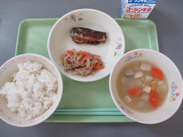 11月27日 牛乳 ご飯 鯵の揚げ煮 ゆで芋のあおさがけ ほうとう汁