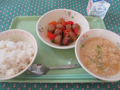 「つくね」は「手でこねて形を作る・手でこねて丸くする」という意味の「つくねる(捏ねる)」からつくねと呼ばれるようになったと言われています。ひき肉や調味料を混ぜて形を作って焼いたり揚げたりします。今日はレバーの入ったつくねを蒸してから、給食センターで作ったたれをかけています。