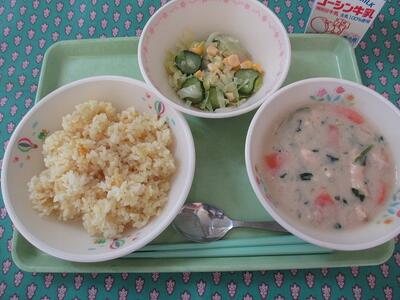 今日は,柏市でとれたかぶをたっぷり使った少しさらっとしたシチューです。葉も根も余すところなく使いました。かぶは煮るととろっとなります。かぶとはまた違う食感ですね。サラダはすりおろしたにんじんやケチャップ,たまねぎの入ったドレッシングです。