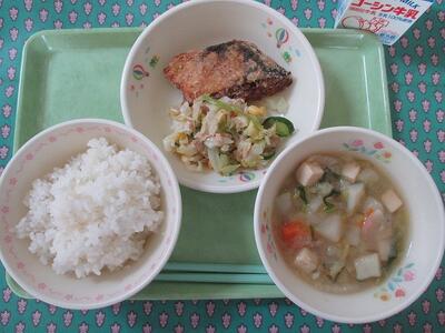 今日は、大津ケ丘中の2年生が考えてくれた献立です。サラダは、本当はじゃが芋の洋風きんぴらでしたが、給食センターの作業上難しいのでアレンジしました。