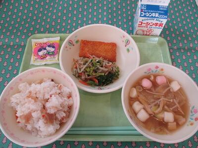 3月13日 牛乳 赤飯(ごま塩) 玉ねぎタレかけハンバーグ チンゲン菜の辛子和え にら入りかきたま汁 お祝いいちごのジュレ