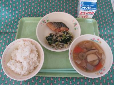 11月24日 牛乳 ご飯 鯖のゆず味噌煮 小松菜のごま和え もみじ生麩とかんぴょうの卵汁 みかん