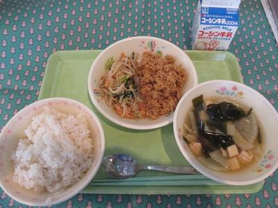 3月18日 牛乳 そぼろ親子煮丼(麦ご飯) 春キャベツの味噌だれ和え