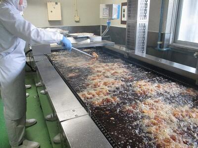 鶏肉の唐揚げは、リクエストの多いメニューの1つです。給食センターでは、特製のタレにつけたあと衣をつけて大きな揚げ物の機械で揚げています。