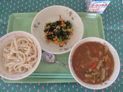 3月7日 牛乳 カレーうどん(うどん・カレー汁) ひじきとブロッコリーの和え物