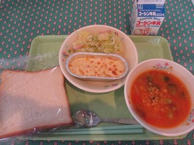 3月15日 牛乳 食パン グラタン フレンチドレッシングサラダ 大豆とひき肉のミネストローネ