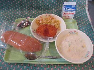 牛乳 丸パン( 横スライス ) ポークコロッケ( ソース ) コールスローサラダ ABCマカロニ入りスープ ヨーグルト
