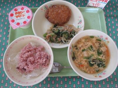 3月13日 牛乳 赤飯(ごま塩) 玉ねぎタレかけハンバーグ チンゲン菜の辛子和え にら入りかきたま汁 お祝いいちごのジュレ