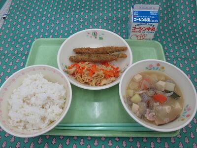 4月17日 牛乳 ご飯 ししゃもの唐揚げ(2本) のりあえ 新玉ねぎとじゃが芋のみそ汁 黒糖大豆