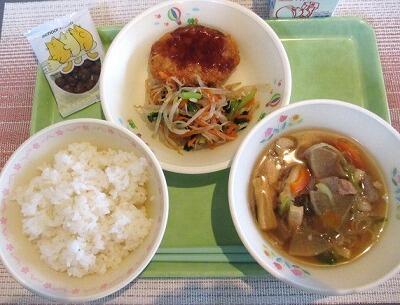 「和食は健康的」と外国でも注目されています。ご飯を中心とした一汁三菜で,栄養バランスの取りやすい食事です。給食ではおかず二品なので汁物を具だくさんにしています。今日は,小学校でリクエストの多かったハンバーグを和食に合う献立にしました。ずっと健康でいられますように。