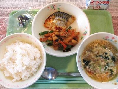 10月10日 牛乳 ご飯 鯖のかぼちゃ味噌焼き 五目豆 むらくも汁(卵入り) ブルーベリー