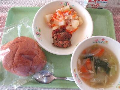 10月11日 牛乳 胚芽パン バジルチキン じゃが芋のチーズ煮 豚肉とすり大豆のスープ