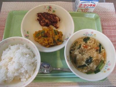 11月5日 牛乳 ご飯 鶏肉のごま味噌かけ かぼちゃのレーズン和え かきたま汁