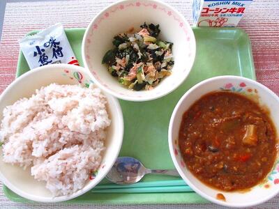 11月7日 牛乳 麦ご飯 さつま芋ときのこのカレー ツナとわかめのサラダ 味付け小魚