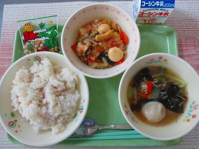 (中学校)牛乳 赤飯 ごま塩 鶏肉の唐揚げ チンゲン菜のツナ和え 柏市産かぶの味噌汁 お祝いいちごゼリー