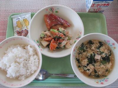 (小学校)牛乳 ご飯 ふりかけ 鶏肉の唐揚げ チンゲン菜のツナ和え 柏市産かぶの味噌汁