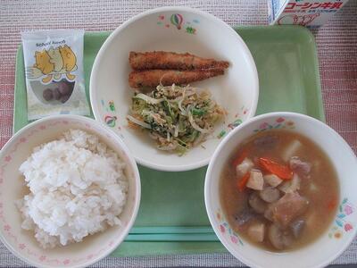 10月28日 牛乳 ご飯 鶏肉の唐揚げ ごぼうとキャベツのお浸し 豚肉と大根のすいとん汁