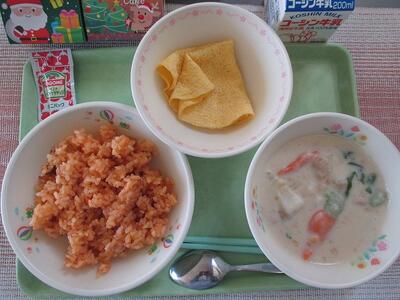 12月20日 牛乳 セルフオムライス(チキンライス・薄焼き卵・ケチャップ)柏かぶのポタージュ セレクトデザート(クリームまたはチョコケーキ)