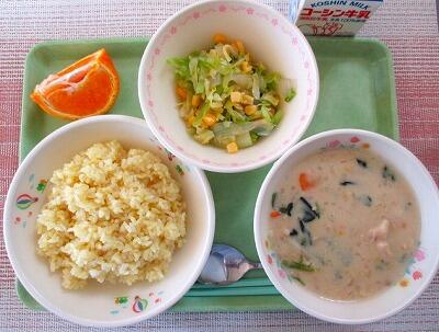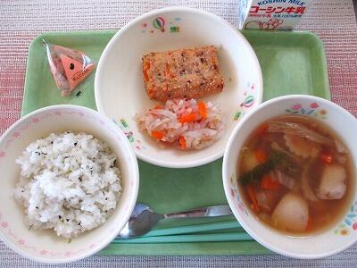 1月9日 牛乳 七草ご飯 松風焼き れんこん入り紅白なます 白玉雑煮 味付き大豆