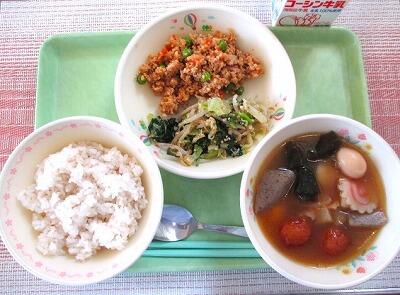 1月20日 牛乳 麦ご飯 三色そぼろ ごま和え おでん