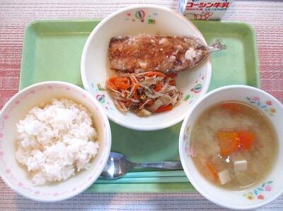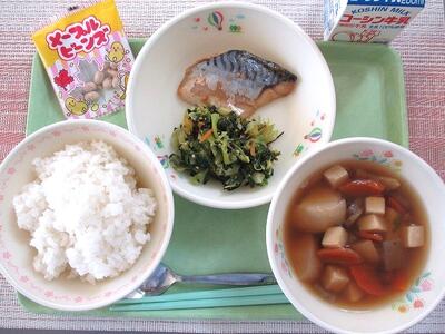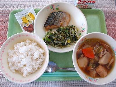 1月27日 牛乳 ご飯 鯖のおろし煮 磯香和え 芋煮 スナックアーモンド