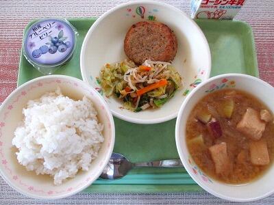 1月24日 牛乳 ご飯 さんが焼き 菜の花入りおかか和え さつま芋と生揚げのみそ汁 柏のブルーベリーゼリー