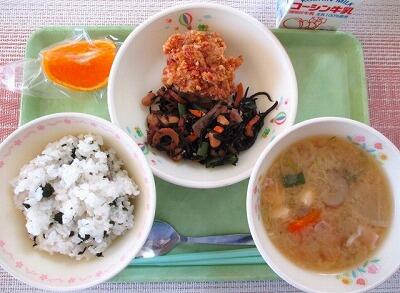 1月29日 牛乳 わかめご飯 鶏肉の唐揚げ ひじきの五目煮 豚汁 ぽんかん