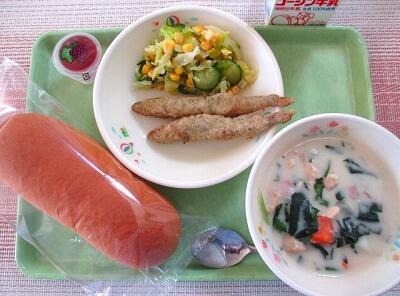 3月6日 牛乳 ミートソーススパゲティ(スパゲティ) じゃが芋と青菜のサラダ チーズドッグ
