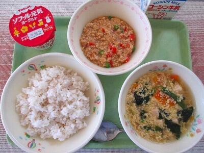 1月31日 牛乳 麦ご飯 鶏肉とバジルの炒め物 卵と春雨のスープ ヨーグルト