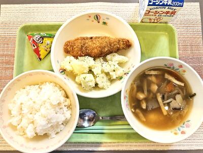 2月3日 牛乳 ご飯 鰯のカレーつつみフライ 磯ポテト きりたんぽ汁 節分福豆