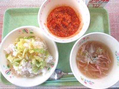 2月12日 牛乳 タコライス(麦ご飯・タコミート・キャベツ) 白菜とフィッシュソーセージのスープ