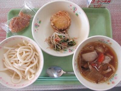 2月13日 牛乳 けんちんうどん(うどん) さつま芋の天ぷら ツナ和え ミニたい焼き