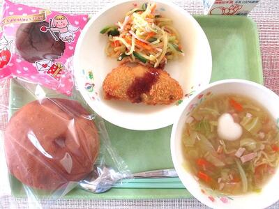 2月14日 牛乳 丸パン 鯵のクリームチーズつつみフライ(ソース) もやしのカレー風味サラダ キャベツとベーコンのスープ バレンタインデザート米粉カップケーキ
