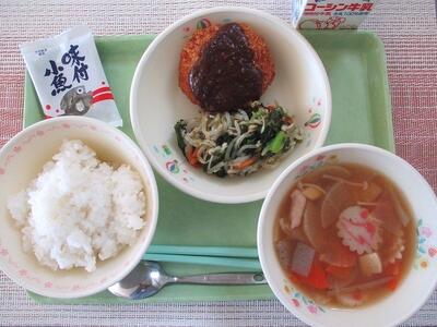 「和食は健康的」と外国でも注目されています。ご飯を中心とした一汁三菜で,栄養バランスの取りやすい食事です。給食ではおかず二品なので汁物を具だくさんにしています。今日は,小学校でリクエストの多かったハンバーグを和食に合う献立にしました。ずっと健康でいられますように。