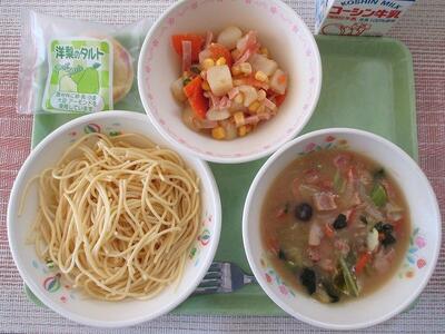 令和7年度の給食が始まりました。食事はみなさんの健康を支える大きな柱です。未来の自分のためにしっかり食べていきましょう。ミートソースは,いつものトマト味に味噌を加えて和風の味わいに仕上げました。サラダに使っている小松菜は,体の成長のために必要なカルシウムを多く含む野菜です。
