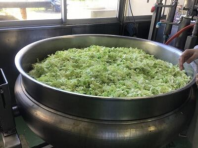 です。合わせて800kg以上になります。大きな釜5つで中華丼の具を作っていますが、具を入れると釜いっぱいになります。