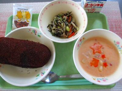 6月12日 牛乳 ココア揚げパン ひじきと青大豆のサラダ キャロットポタージュ スナックアーモンド