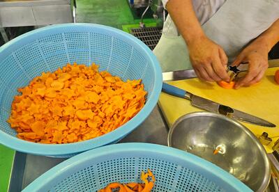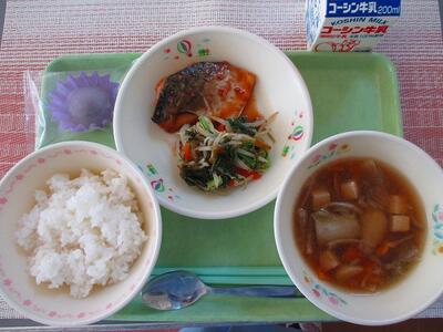 1年中とれるにんじんですが,今の季節は新人参で美味しい時期です。今日はすりおろしたにんじんを入れたポタージュにしました。にんじんに入っているカロテンという栄養は,目の疲れをとったり,病気の予防をしてくれたりします。少しですが,各クラスにラッキー人参が入っているかもしれません。お楽しみに。