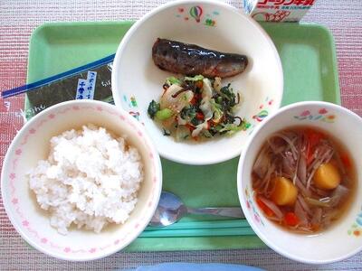 6月13日 牛乳 ご飯 味付けのり 鰯の梅煮 野菜のごま昆布和え かぼちゃ団子汁