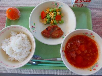 6月17日 牛乳 ご飯 タンドリーチキン(ごま入り) 枝豆とコーンのサラダ ミネストローネスープ 冷凍みかん