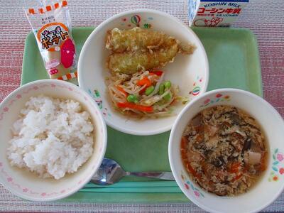 6月19日 牛乳 ご飯 きす磯香天ぷら 枝豆入り三色和え もずくと卵のスープ さつまポテト