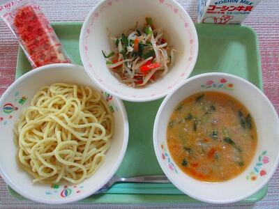 6月20日 牛乳 担々風つけ麺(ちゃんぽん麺) にらともやしのナムル チーズドック