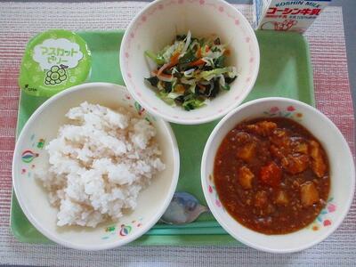 6月24日 牛乳 麦ご飯 チキンカレー 海藻サラダ(青じそドレッシング)マスカットゼリー