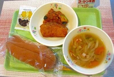 ラタトゥイユは,玉ねぎやなすなどの野菜をニンニクとオリーブオイルで炒めて煮た南フランスの郷土料理です。今日は,千葉県でとれたなすやズッキーニを使っています。なすやズッキーニ・トマトなどの夏野菜には身体を冷やしてくれる働きがあります。旬の夏野菜をたくさん食べて,元気に過ごしてください。フライとラタトゥイユは,お好みでパンにはさんで食べてください。