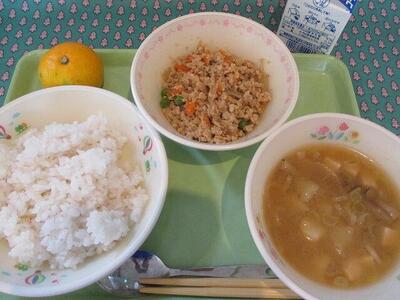 10月4日 牛乳 麦ご飯 ごぼう入り鶏そぼろ しめじと豆腐の味噌汁 みかん