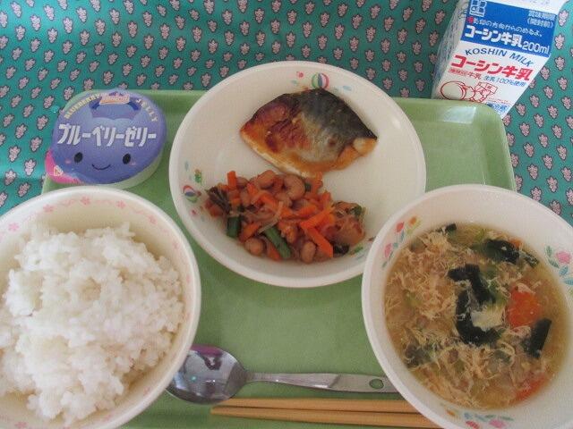 10月10日 牛乳 ご飯 鯖のかぼちゃ味噌焼き 五目豆 むらくも汁 ブルーベリーゼリー