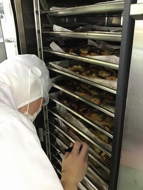 写真は魚を焼いた後温度を測っている様子です。しっかり火が通っているか確認してからみなさんの教室まで届けています。