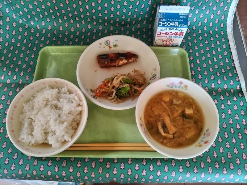 10月12日 牛乳 ご飯 秋刀魚の紅葉煮 ブロッコリーのごま和え 切り干し大根の味噌汁